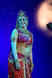Malini studied Kuchipudi with Vempati Chinna Satyam and Mohiniattam with Kalamandalam Guru Gopalakrishnan. She has played a number of dance roles including Narasimha and Rama in Tulasidas's Ramcharitmanas.[51] In 2007, she performed in Mysuru on the eve of Dussehra, where she played the roles of Sati, Parvati and Durga.[52]
