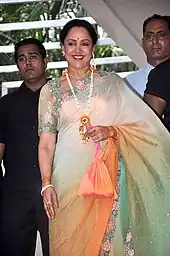 Hema Malini (born 16 October 1948[4]) is an Indian actress, director, producer, and politician who is currently serving as a member of the Lok Sabha from Bharatiya Janata Party (BJP), representing Mathura constituency since 2014. She was a member of the Rajya Sabha from Karnataka from 2011 to 2012, subsequent to her nomination to that chamber from 2003 to 2009 as a member of the Bharatiya Janata Party (BJP) .[5] Primarily known for her work in Hindi films, she has starred in both comic and dramatic roles, and is one of the most popular and successful leading actresses of mainstream Hindi cinema.[6][7][8]