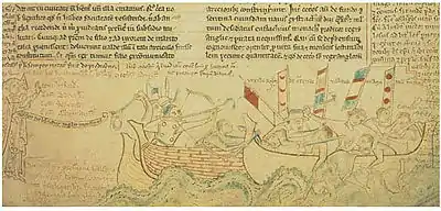 On 24 August 1217, a French fleet arrived off the coast of Sandwich, bringing Louis soldiers, siege engines and fresh supplies.[49] Hubert de Burgh, Henry's justiciar, set sail to intercept it, resulting in the Battle of Sandwich.[50] De Burgh's fleet scattered the French and captured their flagship, commanded by Eustace the Monk, who was promptly executed.[50] When the news reached Louis, he entered into fresh peace negotiations.[50]