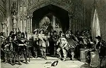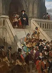 In the Root and Branch petition debate in the Commons, from December 1640 and into 1641, Vane supported, as did Nathaniel Fiennes, the call for radical reforms in the Church of England, a position that put Vane in opposition to his father.[61] Amid a sea of complaints about church governance, he and Fiennes in February 1641 were added to a committee that had been established the previous November to draft a report on the state of the kingdom.[62] Their efforts led Vane to introduce the Root and Branch Bill in May 1641.[63] The debate on the bill was acrimonious, and resulted in a clear indication of parliamentary support for church reform. In its wake mobs invaded churches, removing "scandalous images" and other signs of "popery".[64] Vane made an impassioned speech that brought him to the front of his faction, claiming episcopacy (the governing structure of the Church of England) was a corrupt doctrine "hastening us back again to Rome."[65] The bill died without a vote in August, when more critical matters arose to occupy Parliament.[63][66] When Charles went to Scotland to rally Scottish forces to the royalist cause, the Commons began drafting what became known as the Grand Remonstrance. Many historians have claimed Vane had a role in drafting some of its language; this matter is disputed, but either way Vane did not participate in the debate.[67] Narrowly passed by the Commons in November 1641, the document catalogued many grievances against the king and church, and served to further polarize political affairs.[68] The king refused to enact any of the requested reforms. Upon his return from Scotland, the king also deprived both Vanes, father and son, of their administrative posts, in revenge for their roles in the execution of Strafford.[69]