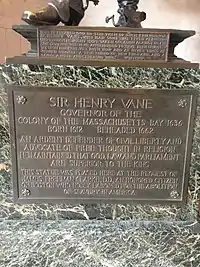 Sir Henry Vane (baptised 26 March 1613 – 14 June 1662), often referred to as Harry Vane and Henry Vane the Younger to distinguish him from his father, Henry Vane the Elder, was an English politician, statesman, and colonial governor. He was briefly present in North America, serving one term as the governor of the Massachusetts Bay Colony, and supported the creation of Roger Williams' Rhode Island Colony and Harvard College. A proponent of religious tolerance, as governor, he defended Anne Hutchinson[2] and her right to teach religious topics in her home which put him in direct conflict with the Puritan leaders in the Massachusetts Colony.[3][4] He returned to England after losing re-election and eventually, Hutchinson was banned from the colony.[5]