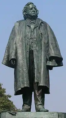 In 1865, Robert E. Bonner of the New York Ledger offered Beecher twenty-four thousand dollars to follow his sister's example and compose a novel;[76] the subsequent novel, Norwood, or Village Life in New England, was published in 1868. Beecher stated his intent for Norwood was to present a heroine who is "large of soul, a child of nature, and, although a Christian, yet in childlike sympathy with the truths of God in the natural world, instead of books."[77] McDougall describes the resulting novel as "a New England romance of flowers and bosomy sighs ... 'new theology' that amounted to warmed-over Emerson".[77] The novel was moderately well received by critics of the day.[78] In 1964 sculptor Joseph Kiselewski[79] created a bronze medal depicting Henry Ward Beecher for the Hall of Fame for Great Americans at the Bronx Community College in New York City. The sculptor John Massey Rhind created the Hall’s bust of Beecher.
