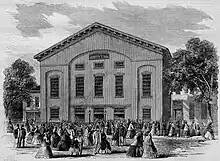 Subsequent hearings and trial, in the words of Walter A. McDougall, "drove Reconstruction off the front pages for two and a half years" and became "the most sensational 'he said, she said' in American history".[62] On October 31, 1873, Plymouth Church excommunicated Theodore Tilton for "slandering" Beecher. The Council of Congregational Churches held a board of inquiry from March 9 to 29, 1874, to investigate the disfellowshipping of Tilton, and censured Plymouth Church for acting against Tilton without first examining the charges against Beecher. As of June 27, 1874, Plymouth Church established its own investigating committee which exonerated Beecher.[63] Tilton then sued Beecher on civil charges of adultery.[64] The Beecher–Tilton trial began in January 1875, and ended in July when the jurors deliberated for six days but were unable to reach a verdict.[65] In February 1876, the Congregational church held a final hearing to exonerate Beecher.[66]