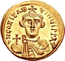 Heraclius (Greek: Ἡράκλειος, translit. Hērákleios; 626 – 642), known by the diminutive Heraclonas or Heracleonas (Greek: Ἡρακλ[ε]ωνᾶς), and sometimes called Heraclius II,[4][lower-alpha 2] was the son of Heraclius and his niece Martina. His father had stipulated in his will that both of his sons, Heraclonas and Constantine III, should rule jointly upon his death. Heraclius also specified that his wife, Martina, was to be called "Mother and Empress" insofar as she might have influence at court as well.[6] The emperor Heraclius died in February 641 from edema. When Martina made the late Emperor's will public she faced staunch resistance to her playing any active role in government, but both Heraclonas and Constantine were proclaimed joint-emperors in February 641 without incident. After Constantine died of tuberculosis in May 641, Heraclonas became sole emperor, under the regency of his mother due to his young age. He reigned until October or November 641, when he was overthrown by Valentinus, a general and usurper of Armenian extract, who installed Constans II, the son of Constantine III. Valentinus had Heraclonas' nose cut off, then exiled him to Rhodes, where he is believed to have died in the following year.