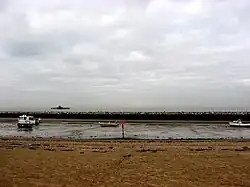The seafront has a 2 miles (3 km) shingle beach, which has been awarded a European Blue Flag and the yellow and blue Seaside Award for its safety and cleanliness.[31] The seafront features a Victorian bandstand and gardens, amusement arcades, and children's play areas. Landmarks by the seafront include the Clock Tower, the sea defence jetty, the off-shore World War II sea fort and the off-shore wind farm. There are seaside cafés, fresh seafood restaurants, guesthouses, beach huts and numerous water-sports facilities.