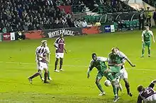 Both clubs have been champions of Scotland four times, although Hearts have the better record in derby matches.[116] Hibs recorded the biggest derby win in a competitive match when they won 7–0 at Tynecastle on New Year's Day 1973.[117] While it has been noted that religious background lies behind the rivalry, that aspect is "muted" and is a "pale reflection" of the sectarianism in Glasgow.[118][119][120] Although the clubs are inescapable rivals, the rivalry is mainly "good-natured" and has had beneficial effects.[121]