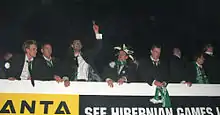 After mismanagement during the late 1980s, Hibs were on the brink of financial ruin in 1990.[36] Wallace Mercer, the chairman of Hearts, proposed a merger of the two clubs,[36] but the Hibs fans believed that the proposal was more like a hostile takeover.[37] They formed the Hands off Hibs group to campaign for the continued existence of the club.[37][38] This succeeded when a prominent local businessman, Kwik-Fit owner Sir Tom Farmer, acquired a controlling interest in Hibs.[39] The fans were able to persuade Farmer to take control despite the fact that he had no great interest in football.[39] Farmer was persuaded in part by the fact that a relative of his had been involved in the rescue of Hibs from financial ruin in the early 1890s.[22] After the attempted takeover by Mercer, Hibs had a few good years in the early 1990s, winning the 1991 Scottish League Cup Final and finishing in the top five in the league in 1993, 1994 and 1995. Soon after Alex McLeish was appointed as manager in 1998, Hibs were relegated to the First Division,[40] but immediately won promotion back to the SPL in 1999.[41]