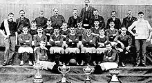 The club was founded in 1875 by Irishmen living in the Cowgate area of Edinburgh.[14] The name Hibernian (deriving from Hibernia, an ancient name for Ireland[5]), the colour green, the Gaelic harp and the Irish language phrase Erin Go Bragh (meaning Ireland Forever) were adopted as symbols early on.[15] Founder Fr. Edward Joseph Hannan was the first president of the club and Michael Whelahan its first team captain.[16] James Connolly, the famous socialist and Irish Republican leader, was a Hibs fan,[17][18] while the club were "closely identified" with the Irish Home Rule Movement during the 1880s.[11] There was some sectarian resistance initially to an Irish club participating in Scottish football,[14] but Hibs established themselves as a force in Scottish football in the 1880s.[5][11][17] Hibs were the first club from the east coast of Scotland to win a major trophy, the 1887 Scottish Cup. They went on to defeat Preston North End, who had reached the semi-finals of the 1887 FA Cup, in a friendly match described as the Association Football Championship of the World Decider.[19][20][21]