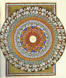 Hildegard said that she first saw "The Shade of the Living Light" at the age of three, and by the age of five, she began to understand that she was experiencing visions.[26] She used the term 'visio' (the Latin for "vision") to describe this feature of her experience and she recognized that it was a gift that she could not explain to others. Hildegard explained that she saw all things in the light of God through the five senses: sight, hearing, taste, smell, and touch.[27] Hildegard was hesitant to share her visions, confiding only to Jutta, who in turn told Volmar, Hildegard's tutor and, later, secretary.[28] Throughout her life, she continued to have many visions, and in 1141, at the age of 42, Hildegard received a vision she believed to be an instruction from God, to "write down that which you see and hear."[29] Still hesitant to record her visions, Hildegard became physically ill. The illustrations recorded in the book of Scivias were visions that Hildegard experienced, causing her great suffering and tribulations.[30] In her first theological text, Scivias ("Know the Ways"), Hildegard describes her struggle within: