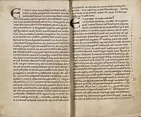 Hildegard's Lingua ignota (Unknown Language) consisted of a series of invented words that corresponded to an eclectic list of nouns. The list is approximately 1000 nouns; there are no other parts of speech.[75] The two most important sources for the Lingua ignota are the Wiesbaden, Hessische Landesbibliothek 2 (nicknamed the Riesenkodex)[75] and the Berlin MS.[41] In both manuscripts, medieval German and Latin glosses are written above Hildegard's invented words. The Berlin MS contains additional Latin and German glosses not found in the Riesenkodex.[41] The first two words of the Lingua as copied in the Berlin MS are: Aigonz (German, goth; Latin, deus; English, god) and Aleganz (German, engel; Latin, angelus; English, angel).[76]