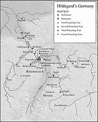 Many abbots and abbesses asked her for prayers and opinions on various matters.[1] She traveled widely during her four preaching tours.[85] She had several devoted followers, including Guibert of Gembloux, who wrote to her frequently and became her secretary after Volmar's death in 1173. Hildegard also influenced several monastic women, exchanging letters with Elisabeth of Schönau, a nearby visionary.[86]