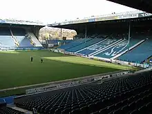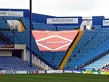 After the Hillsborough disaster in 1989 the lower tier terrace was closed for two years and its fencing covered with blue tarp[22] for the remainder of the 1988–89 season. The terrace remained closed and out of use for 1989–90,[23] and its fences were removed entirely prior to the 1990–91 season. The lower tier terrace was converted to 2,294 seats and was re-opened prior to the start of the 1991–92 season.[24] The North West Corner was the last section of the stand to be made all seated, adding another 1,337 seats to the existing structure. The old wooden seats in the upper tier were replaced with bigger plastic ones in 1997. During the 2012–13 season the first row of seats was removed from the lower tier, after an incident involving Leeds United supporters when a minor pitch invasion took place. In the summer of 2013 small gates were installed at the front of the gangways for emergency access to the pitch.