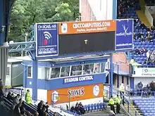 The stadium control area is in the southwest area of the ground, between the South and West stands. The most dominant feature is the video scoreboard. The current scoreboard was installed in May 2015 and replaced an older electronic dot-matrix style electronic scoreboard.