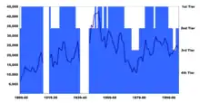 The highest seasonal average attendance at Hillsborough was 42,520 in the 1952–53 season in Division 1. The highest average attendance in the second tier of English football was 41,682 in the 1951–52 season, which saw the club gain promotion from Division 2 and Derek Dooley score a record 46 league goals. The highest average attendance in the third tier of English football was achieved in the 2004–05 season when an average of 23,107 fans watched the League One games at Hillsborough.