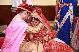 Many types of rituals are celebrated in Bengali Hindu wedding. These include Patipatra, Pankhil, Ashirvad, Aiburo Bhat, Dadhi Mangal, Gaye Halud, Shankha Kangkan, Ganga Baran, Jalsoi, Bar Baran, Satpak, Shubhadrishti, Mala Badal, Kanya Sampradan, Anjali, Sindoor Daan, Basi Biye, Basar Jagaran, Kanakanjali, Badhu Baran, Kalratri, Bhat Kapor, Bou Bhat, Phulshajya etc.[48]