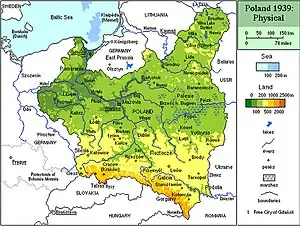 The Germans wanted restoration of the pre-Versailles Treaty borders and so they launched new demands on Poland.[75][76] They insisted on a plebiscite to determine the ownership of the "Polish corridor". Only those living in the corridor prior to 1918 would be allowed to vote. The proposal called for a subsequent population exchange that would move all Germans, then in Poland, out of the final region declared to be "Poland".[77] The same would occur for all Poles living in what was declared, after the vote, to be "Germany". Danzig was to become part of Germany regardless of the vote, but if Germany lost, it was still guaranteed access to East Prussia through an autobahn system that it would administer, stretching from Germany proper to Danzig to East Prussia.[78] If Poland lost the vote, the corridor would go to Germany and the seaport of Gdynia would become a Polish exclave with a route connecting Poland with Gdynia. After the British-French guarantee of support for Poland was announced on April 3, negotiations over Danzig ended. Germany invaded Poland on September 1, 1939.[79][80][81][82] The issue of Danzig was not the cause of the German invasion; Hitler told his generals in May 1939: “It is not Danzig that is at stake. For us, it is a matter of expanding our living space in the east and making food supplies secure.”[83] The total destruction of the Polish state, Polish culture, and indeed the Polish population had become Hitler's main objective. He wanted the agricultural land to resettle German farmers.[84]
