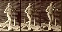 The daguerreotypes were not without drawbacks, however. The main difficulty was that they could only be reproduced by photographing the original picture since each image was an original and the all-metal process does not use negatives. In addition, the earliest daguerreotypes had exposure times ranging from three to fifteen minutes, making them somewhat impractical for portraiture. Unlike earlier drawings, action could not be shown. The poses that the models struck had to be held very still for a long time. Because of this, the standard pornographic image shifted from one of two or more people engaged in sex acts to a solitary woman exposing her genitals. Since one picture could cost a week's salary, the audience for these nudes mostly consisted of artists and the upper echelon of society. It was cheaper to hire a prostitute and experience the sex acts than it was to own a picture of them in the 1840s.[3] Stereoscopy was invented in 1838 and became extremely popular for daguerreotypes,[48][49] including the erotic images. This technology produced a type of three dimensional view that suited erotic images quite well. Although thousands of erotic daguerreotypes were created, only around 800 are known to survive; however, their uniqueness and expense meant that they were once the toys of rich men. Due to their rarity, the works can sell for more than 10,000 GBP.[3]