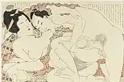 In Japan, erotic art found its widest success in the medium of woodblock printing, in the style known as shunga (春画, 'spring pictures'), to which many classical woodblock artists, such as Suzuki Harunobu and Kitagawa Utamaro, contributed a large number of works. Erotic painted hand scrolls were also very popular. Shunga appeared in the 13th century, and continued to grow in popularity, despite occasionally attempts by the authorities to clamp down on their production, the first instance of which being a ban on erotic books known as kōshokubon (好色本) issued by the Tokugawa shogunate in Kyōhō 7 (1722). Shunga only ceased to be produced in the 19th century, following the invention and wider spread of photography, which mainly usurped the medium.[1][28]
