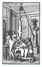 In the 17th century, numerous examples of pornographic or erotic literature began to circulate. These included L'Ecole des Filles, a French work printed in 1655 that is considered to be the beginning of pornography in France. It consists of an illustrated dialogue between two women, a 16-year-old and her more worldly cousin, and their explicit discussions about sex. The author remains anonymous to this day, though a few suspected authors served light prison sentences for supposed authorship of the work.[42] In his famous diary, Samuel Pepys records purchasing a copy for solitary reading and then burning it so that it would not be discovered by his wife; "the idle roguish book, L'escholle de filles; which I have bought in plain binding… because I resolve, as soon as I have read it, to burn it."[43]