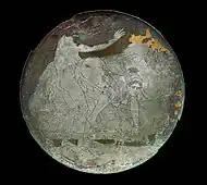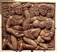 A vast number of artifacts have been discovered from ancient Mesopotamia depicting explicit sexual intercourse.[17][18] Glyptic art from the Sumerian Early Dynastic Period frequently shows scenes of frontal sex in the missionary position.[17] In Mesopotamian votive plaques from the early second millennium BC, the man is usually shown entering the woman from behind while she bends over, drinking beer through a straw.[17] Middle Assyrian lead votive figurines often represent the man standing and penetrating the woman as she rests on top of an altar.[17] Scholars have traditionally interpreted all these depictions as scenes of ritual sex,[17] but they are more likely to be associated with the cult of Inanna, the goddess of sex and prostitution.[17] Many sexually explicit images were found in the temple of Inanna at Assur,[17] which also contained models of male and female sexual organs,[17] including stone phalli, which may have been worn around the neck as an amulet or used to decorate cult statues,[17] and clay models of the female vulva.[17]