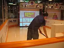 Interactive displays are featured in the NHLPA Be A Player Zone. At the Source For Sports Shoot Out, visitors take shots using real pucks at a computer simulation of goaltender Ed Belfour. Its counterpart, Lay's Shut Out, has visitors playing goaltender, blocking shots from computer simulations of players Wayne Gretzky and Mark Messier.[29] The TSN/RDS Broadcast Zone provides a look at how hockey broadcasting works and allows users to record messages that may be displayed on both the Hockey Hall of Fame's website, and the TSN/RDS networks.[30]