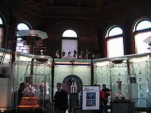 The Hockey Hall of Fame has 15 exhibit areas covering 60,000 square feet (5,600 m2).[23] Visitors can view trophies, memorabilia and equipment worn by players during special games. The Esso Great Hall, described as "a Cathedral to the icons of Hockey",[24] contains portraits and biographical information about every Hall of Fame honoured member. The centrepiece of the Great Hall is the Stanley Cup; for part of the year a replica is put on display when the presentation cup travels outside of the Hall of Fame. The original version of the Cup and the older rings, as well as all of the current National Hockey League trophies, are displayed in the bank vault, an alcove off the Great Hall. The Hall of Fame induction ceremony is annually held in the Great Hall.[24]