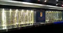 The IIHF agreed to transfer its exhibits from the International Hockey Hall of Fame in Kingston, Ontario, to the Hockey Hall of Fame in 1998.[34] The World of Hockey Zone is sponsored by Tissot.[35][36] The zone includes the IIHF Hockey Hall of Fame honour roll, listing each inductee by country and year of enshrinement. Each national association member of the IIHF is represented in the collection of artifacts in the display, which includes many national team hockey jerseys. The World of Hockey also recognizes members of the Triple Gold Club, and displays memorabilia from the "Miracle on Ice" at the 1980 Winter Olympic Games. Other notable events included are the 1972 Summit Series, the men's and women's Ice Hockey World Championships, national-level hockey leagues in Europe, the Spengler Cup, the World Cup of Hockey, and the Canada Cup.[35][36]