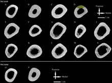 The cortical bone (the outer layer of the bone) is extraordinarily thickened, particularly in East Asian populations. The skullcaps have oftentimes been confused with fossil turtle carapaces,[114] and the medullary canal in the long bones (where the bone marrow is stored, in the limbs) is extremely narrowed (medullary stenosis). This degree of thickening is usually exhibited in semi-aquatic animals which used their heavy (pachyosteosclerotic) bones as ballasts to help them sink, induced by hypothyroidism. Male specimens have thicker cortical bone than females.[115]