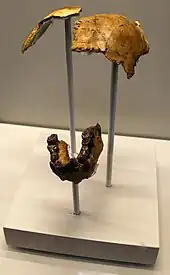 The first recognised remains—OH 7, partial juvenile skull, hand, and foot bones dating to 1.75 million years ago (mya)—were discovered in Olduvai Gorge, Tanzania, in 1960 by Jonathan Leakey. However, the actual first remains—OH 4, a molar—were discovered by the senior assistant of Louis and Mary Leakey (Jonathan's parents), Heselon Mukiri, in 1959, but this was not realised at the time.[2] By this time, the Leakeys had spent 29 years excavating in Olduvai Gorge for early hominin remains, but had instead recovered mainly other animal remains as well as the Oldowan stone-tool industry. The industry had been ascribed to Paranthropus boisei (at the time "Zinjanthropus") in 1959 as it was the first and only hominin recovered in the area, but this was revised upon OH 7's discovery.[2] In 1964, Louis, South African palaeoanthropologist Phillip V. Tobias, and British primatologist John R. Napier officially assigned the remains into the genus Homo as, on recommendation by Australian anthropologist Raymond Dart, H. habilis, the specific name meaning "able, handy, mentally skillful, vigorous" in Latin.[3] The specimen's association with the Oldowan (then considered evidence of advanced cognitive ability) was also used as justification for classifying it into Homo.[4] OH 7 was designated the holotype specimen.[3]