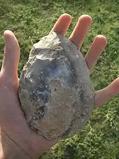 In the mid-19th century, French archaeologist Jacques Boucher de Crèvecœur de Perthes began excavation at St. Acheul, Amiens, France, (the area where the Acheulian was defined), and, in addition to hand axes, reported perforated sponge fossils (Porosphaera globularis) which he considered to have been decorative beads. This claim was completely ignored. In 1894, English archaeologist Worthington George Smith discovered 200 similar perforated fossils in Bedfordshire, England, and also speculated that their function was beads, though he made no reference to Boucher de Perthes' find, possibly because he was unaware of it. In 2005, Robert Bednarik reexamined the material, and concluded that—because all the Bedfordshire P. globularis fossils are sub-spherical and range 10–18 mm (0.39–0.71 in) in diameter, despite this species having a highly variable shape—they were deliberately chosen. They appear to have been bored through completely or almost completely by some parasitic creature (i. e., through natural processes), and were then percussed on what would have been the more closed-off end to fully open the hole. He also found wear facets which he speculated were begotten from clacking against other beads when they were strung together and worn as a necklace.[49] In 2009, Solange Rigaud, Francisco d'Errico and colleagues noticed that the modified areas are lighter in colour than the unmodifed, suggesting they were inflicted much more recently such as during excavation. They were also unconvinced that the fossils could be confidently associated with the Acheulian artefacts from the sites, and suggested that—as an alternative to archaic human activity—apparent size-selection could have been caused by either natural geological processes or 19th-century collectors favouring this specific form.[50]