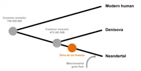 In 1997, Spanish archaeologist José María Bermúdez de Castro, Arsuaga, and colleagues described the roughly million-year-old H. antecessor from Gran Dolina, Sierra de Atapuerca, and suggested supplanting this species in the place of H. heidelbergensis for the LCA between modern humans and Neanderthals, with H. heidelbergensis descending from it and being a strictly European species ancestral to only Neanderthals.[26] They later recanted.[27] In 2020, Dutch molecular palaeoanthropologist Frido Welker and colleagues analysed ancient proteins collected from an H. antecessor tooth found that it was a member of a sister lineage to the LCA rather than being the LCA itself (that is, H. heidelbergensis did not derive from H. antecessor).[28]