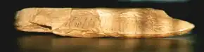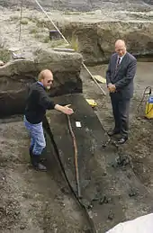 The appearance of repeated fire usage—earliest in Europe from Beeches Pit, England, and Schöningen, Germany—roughly coincides with hafting technology (attaching stone points to spears) best exemplified by the Schöningen spears.[56] These nine wooden spears and spear fragments—in addition to a lance, and a double-pointed stick—date to 300,000 years ago and were preserved along a lakeside. The spears vary from 2.9–4.7 cm (1.1–1.9 in) in diameter, and may have been 210–240 cm (7–8 ft) long, overall similar to present day competitive javelins. The spears were made of soft spruce wood, except for spear 4 which was (also soft) pine wood. This contrasts with the Clacton spearhead from Clacton-on-Sea, England, perhaps roughly 100,000 years older, which was made of hard yew wood. The Schöningen spears may have had a range of up to 35 m (115 ft), though would have been more effective short range within about 5 m (16 ft), making them effective distance weapons either against prey or predators. Besides these two localities, the only other site which provides solid evidence of European spear technology is the 120,000-year-old Lehringen site, district of Verden, in Lower Saxony, Germany, where a 238 cm (8 ft) yew spear was apparently lodged in an elephant.[58] In Africa, 500,000-year-old points from Kathu Pan 1, South Africa, may have been hafted onto spears. Judging by indirect evidence, a horse scapula from the 500,000-year-old Boxgrove shows a puncture wound consistent with a spear wound. Evidence of hafting (in both Europe and Africa) becomes much more common after 300,000 years.[59]