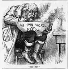Greeley attended the convention as a substitute for Oregon delegate Leander Holmes, who was unable to attend. In Chicago, he promoted Bates but deemed his cause hopeless and felt that Seward would be nominated. In conversations with other delegates, he predicted that, if nominated, Seward could not carry crucial battleground states such as Pennsylvania.[63] Greeley's estrangement from Seward was not widely known, giving the editor more credibility.[64] Greeley (and Seward) biographer Glyndon G. Van Deusen noted that it is uncertain how great a part Greeley played in Seward's defeat by Lincoln—he had little success gaining delegates for Bates. On the first two ballots, Seward led Lincoln, but on the second only by a small margin. After the third ballot, on which Lincoln was nominated, Greeley was seen among the Oregon delegation, a broad smile on his face.[65] According to Pulitzer Prize-winning historian Doris Kearns Goodwin, "it is hard to imagine Lincoln letting Greeley's resentment smolder for years as Seward did".[66]