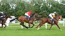 The gallop is the gait of the classic race horse. Modern Thoroughbred horse races are seldom longer than 1.5 miles (2.4 km), though in some countries Arabian horses are sometimes raced as far as 2.5 miles (4.0 km). The fastest galloping speed is achieved by the American Quarter Horse, which in a short sprint of a quarter mile (0.25 miles (0.40 km)) or less has been clocked at speeds approaching 55 miles per hour (88.5 km/h).[13] The Guinness Book of World Records lists a Thoroughbred as having averaged 43.97 miles per hour (70.76 km/h) over a two-furlong (0.25 miles (402 m)) distance in 2008.[14]
