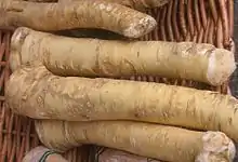 Horseradish grows up to 1.5 meters (5 feet) tall, with hairless bright green unlobed leaves up to 1 m (3 ft 3 in) long that may be mistaken for docks (Rumex).[3]: 423 It is cultivated primarily for its large, white, tapered root.[4][5][6][7] The white four-petalled flowers are scented and are borne in dense panicles.[3] Established plants may form extensive patches[3] and may become invasive unless carefully managed.[8]