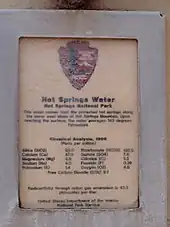 In 1905 curative characteristics were being ascribed to radium and Bertram Boltwood of Yale examined these waters. There is a measurable level of radioactivity primarily due to dissolved radon gas, with some radium. At the time collection and distribution equipment was designed to retain the radon gas, while now it is designed to allow it to escape. The level of exposure to radiation that results from bathing appears to be similar to the level that would result from sitting in the sun for the same period of time. The park water is considered well within safe limits and similar to other natural waters throughout the world.[9]