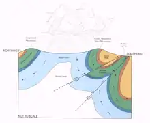 During most of the Paleozoic Era, what became the Ouachita Mountains was the bottom of a shallow sea, where several sedimentary layers were created. About 500 million years ago a collision of the South American Plate with the North American Plate caused the shale and sandstone layers to fracture and fissure, creating mountains of the folded rocks.[4] The thermal springs emerge from the plunging crest line of a large overturned anticline in the Zigzag Mountains of the Ouachita anticlinorium. The overturned anticline plunges toward the southwest into the Mazarn Basin. There are two recognized major thrust faults trending nearly parallel to fold axes that define the northern and southern limits of the thermal springs discharge area. The northern fault extends nearly parallel to Fountain Street northeastward about 9,200 ft (2,800 m) onto the southeast flank of North Mountain, and dips about 26 degrees north. At the northern extent of the thermal springs, this fault is suggested to form along the bedding contact of the Hot Springs Sandstone and Stanley Shale, with the Stanley Shale forming the hanging wall of the fault. The southern fault extends northeastward about 9,000 ft (2,700 m) roughly along the axis of the Hot Springs anticline, and dips about 44 degrees north. It has been proposed that a fault splits away from the southern fault, trends west and connects with the northern fault. A natural ravine trends along the location of this fault. Extensive cracks, joints, and fissures in the Bigfork Chert, Arkansas Novaculite, and the Hot Springs Sandstone allow the water to flow in the thermal springs area.[21] Dissolved minerals in the water precipitate to form the white to tan travertine or "tufa rock" seen near the openings of the hot springs.[4]