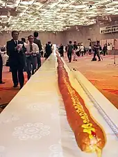 The world's longest hot dog had been 60 meters (197 ft) long and rested within a 60.3-meter (198 ft) bun. The hot dog was prepared by Shizuoka Meat Producers for the All-Japan Bread Association, which baked the bun and coordinated the event, including official measurement for the world record. The hot dog and bun were the center of a media event in celebration of the Association's 50th anniversary on August 4, 2006, at the Akasaka Prince Hotel in Tokyo.[71]