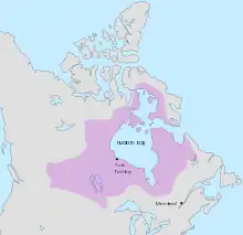 A royal charter from King Charles II incorporated "The Governor and Company of Adventurers of England, trading into Hudson's Bay" on 2 May 1670.[5] The charter granted the company a monopoly over the region drained by all rivers and streams flowing into Hudson Bay in northern parts of present-day Canada. The area was named "Rupert's Land"[30] after Prince Rupert,[31] the first governor of the company appointed by the King. This drainage basin of Hudson Bay spans 3,861,400 square kilometres (1,490,900 sq mi),[32] comprising over one-third of the area of modern-day Canada, and stretches into the present-day north-central United States. The specific boundaries remained unknown at the time. Rupert's Land would eventually become Canada's largest land "purchase" in the 19th century.[33]