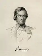 Hugh Lupus Grosvenor was the second and eldest surviving son of Richard Grosvenor, 2nd Marquess of Westminster and Lady Elizabeth Leveson-Gower, the younger daughter of George Leveson-Gower, the 2nd Marquess of Stafford and later the 1st Duke of Sutherland.[2] He was educated at Eton College and, until 1847, at Balliol College, Oxford.[1] He left Oxford without taking a degree to become Member of Parliament (MP) for Chester. This seat, a family borough, had been held by his uncle, Robert Grosvenor (later the 1st Baron Ebury), who decided to move to one of the two unopposed Middlesex seats. In 1851, he toured India and Ceylon.