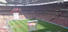 In March 2015, Steve Bruce signed a further three-year deal with the club.[65][66] Hull were relegated from the Premier League after the 2014–15 season, finishing 18th with 35 points. Relegation had been confirmed after Hull drew 0–0 at home to Manchester United and fellow relegation-candidates Newcastle United beat West Ham United 2–0 to survive the drop.[67] On 27 October 2015, Hull beat eventual Premier League champions Leicester City in a penalty-shootout to take them through to their first-ever quarter-final appearance in the Football League Cup.[68][69] Later that season, the Tigers reached the Championship play-offs where they beat Derby County 3–2 on aggregate in the semi-finals to advance to the final, where they faced Sheffield Wednesday on 28 May 2016. Hull secured an immediate return to the Premier League by winning 1–0 in the final after Mohamed Diamé scored in the second-half with a long-ranged effort.[70]