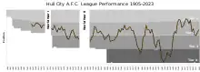 Hull were Third Division runners-up in 2003–04 and League One runners-up in 2004–05. These back-to-back promotions took City into the Championship, the second tier of English football.[10] The 2005–06 season, the club's first back in the second tier, saw Hull finish in 18th place, 10 points clear of relegation and their highest league finish for 16 years.[3][10]