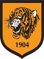 In 1975, the tiger's head was granted as a heraldic badge by the College of Arms to the English Football League for use by Hull City, blazoned as a "Bengal tiger's head erased proper".[94] Subsequently, the club's initials of HCAFC were shown for four years on the shirt. After this, a crest with the tiger's head with the club's name underneath was used from 1979 until 1998. The next crest, which was in use throughout Hull's historic rise from the fourth tier, features the tiger's head in an amber shield with the club's name, along with the club's nickname, The Tigers.[8]