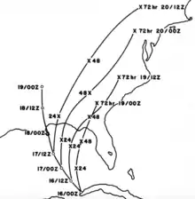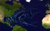 Hurricane Camille originated from a tropical wave that moved off the western coast of Africa on August 5, 1969. It tracked quickly westward along the 15th parallel north;[4] several days later, a tropical disturbance became clearly identifiable on satellite imagery on August 9. By that time, the thunderstorm activity in the disturbance concentrated into a circular area of convection. On the next day, the storm moved through the Lesser Antilles, although there was no evidence of a closed circulation. On August 13, the wave passed near or over the southern coast of Jamaica as its convection spread northeastward through the Bahamas. Subsequently, it began a slower motion to the northwest. It is believed that the tropical wave organized into a tropical depression shortly thereafter, early on August 14, and it became a tropical storm a few hours later. On the morning of August 14, the Hurricane Hunters flew to investigate for a closed circulation near the Bahamas and near the Cayman Islands.[5] The crew observed a developing center in the western Caribbean, and winds had reached tropical storm status. By then, the storm had strengthened into a strong tropical storm with winds of 60 mph (97 km/h), about 50 miles (80 km) west-northwest of Grand Cayman.[5][6]