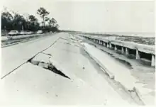 The pressure fell to 27.80 inches of mercury (941 hPa) at Garden Island. Winds gusted to 125 miles per hour (201 km/h) at Slidell as their pressure sank to 28.75 inches of mercury (974 hPa) on August 19. Almost total destruction was seen from Venice to Buras. Ostrica Lock measured a storm surge of 16 feet (4.9 m). Water overwashed U.S. Highway 90 to a depth of 10 feet (3.0 m).[22] The highest rainfall report from the state was 5.23 inches (133 mm) from Slidell.[23] Camille caused about $322 million (1969 dollars) of damage in Louisiana.[5] The storm turned just in time to avoid a direct hit to the City of New Orleans, which was devastated just four years prior by Hurricane Betsy. The worst effects in New Orleans proper were flooding from some levees, particularly in the lowest lying areas, including the Lower Ninth Ward, which suffered the most severe flooding during Betsy.