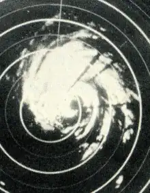 Upon first being classified as a tropical storm, Camille was located in an area favorable for further strengthening, although initially it slowly intensified. It was located within an area of very light wind shear and an overall warm environment. Additionally, the storm developed strong low-level inflow from the deep southern Caribbean, which continuously brought moisture into the storm.[5] Throughout its duration, it was a small tropical cyclone, although with a radius of gale-force winds spreading 100 miles (160 km) to the north, the storm's thunderstorm area quickly spread over Cuba. As the storm approached the western coast of Cuba, it began rapid deepening, reaching hurricane status and less than 12 hours later attained winds of 110 mph (180 km/h). Prior to landfall, its eye was tracked by radar from Havana; it is estimated the hurricane moved ashore between Cape San Antonio and Guane late on August 15 as a strong Category 2 hurricane. Camille was a small hurricane as it crossed western Cuba, and its winds decreased slightly to 105 mph (169 km/h) over land before it emerged into the Gulf of Mexico.[6]