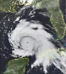 ![]() Camille as a powerful Category 5 hurricane in the Gulf of Mexico, on August 16 | |
