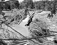 The storm dropped torrential rainfall of 12 to 20 inches (300 to 510 mm), with a maximum of 27 inches (690 mm).[31] Most of the rainfall occurred in Virginia during a 3–5 hour period on August 19–20. More than five inches of rain fell near the North Fork of the Tye River in only half an hour with the grounds already saturated from previous rains.[33] Many rivers flooded across the state, with the worst being the James River in Richmond with a peak crest of 28.6 feet (8.7 m). Many rivers in Virginia and West Virginia set records for peak flood stages, causing numerous mudslides along mountainsides. In the mountain slopes between Charlottesville and Lynchburg, more than 26 inches (660 mm) of rain fell in 12 hours, but the worst was in Nelson County where 27 inches (690 mm) fell. There, rainfall was so heavy that reports were received of birds drowning in trees, cows floating down the Hatt Creek and of survivors having to cup hands around their mouth and nose in order to breathe through the deluge. Though the official rainfall was recorded as 27 inches, unofficial estimates are much greater. Some estimate that more than 40 inches of rain fell at Davis Creek. Most gauges were washed away; however, it was reported that an empty 55-gallon drum that was not even in the center of the heaviest rainfall had 31 inches of water in it after Camille passed.[37] "So much rain fell in such a short time in Nelson County that, according to the National Weather Service at the time, it was 'the probable maximum rainfall which meteorologists compute to be theoretically possible.'"[38]