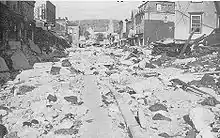 Damage was greatest in Connecticut, where floods affected about two-thirds of the state.[17] It was the largest flood on record in the state's history.[31] All major streams and valleys were flooded during the storm, including hundreds of tributaries, and 30 gauges in the state reported the highest level on record.[17] The Connecticut River at Hartford reached the third-highest level on record at the time, cresting at 30.6 ft (9.3 m), or 14.6 ft (4.5 m) above flood stage.[8] Although there was rural damage, the city of Hartford was spared from flooding due to previously constructed dykes.[21] The Naugatuck River had significant flooding that damaged or destroyed every bridge across it and did extensive damage in Ansonia. In Waterbury, the river washed buildings and railroad girders into a bridge.[17] In the city, 30 people were killed, including 26 in 13 houses that were washed away in one block.[36] The Quinebaug River flooded the city of Putnam at the same time that a major fire originated at a magnesium plant.[17][37] Much of the commercial district of Winsted was destroyed by the Mad River, which reached 10 ft (3.0 m) deep; the floods destroyed most buildings on the south side of the town's Main Street, and carried away several cars from a car dealership. The local newspaper reported that 95% of businesses were destroyed or severely damaged in Winsted.[36] High rivers destroyed historical sites and buildings,[17] and statewide Diane destroyed 563 houses.[21] There were 77 deaths in the state and $350 million in damage.[35] Most of the damage in the state was industrial or commercial damage.[21]