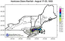 Hurricane Diane's path over the eastern United States brought heavy rainfall, fueled by unusually moist air resulting from abnormally high sea surface temperatures.[20] The worst flooding was in eastern Pennsylvania, northern New Jersey, southeastern New York, and southern New England.[8] Of the 287 stream gauges in the region, 129 reported record levels during the course of the event. Many streams reported discharge rates of more than double the previous records.[17] Most of the flooding occurred along small rivers that rose to flood stage within hours, largely impacting populated areas;[8] there were around 30 million people in the region affected by the floods.[17] Overall, 813 houses were destroyed,[21] with 14,000 heavily damaged.[22] The storms damage caused over 35,000 families to re locate.[23] The floods also severed infrastructure and affected several summer camps.[8] Damage to public utilities was estimated at $79 million. Flooding in rural areas resulted in landslides in the mountains, while destroyed crops cost an estimated $7 million. Hundreds of miles of roads and bridges were also destroyed, accounting for $82 million in damage.[21] Damage from Diane's winds were generally minor.[17] The hurricane caused $831.7 million in damage,[24] of which $600 million was in New England,[2] making it the costliest hurricane in American history at the time.[21] Taking into account indirect losses, such as loss of wages and business earnings, Diane was described as "the first billion dollar hurricane."[2] This contributed to 1955 being the costliest Atlantic hurricane season on record at the time.[2] Overall, there were at least 184 deaths, potentially as many as 200.[25]